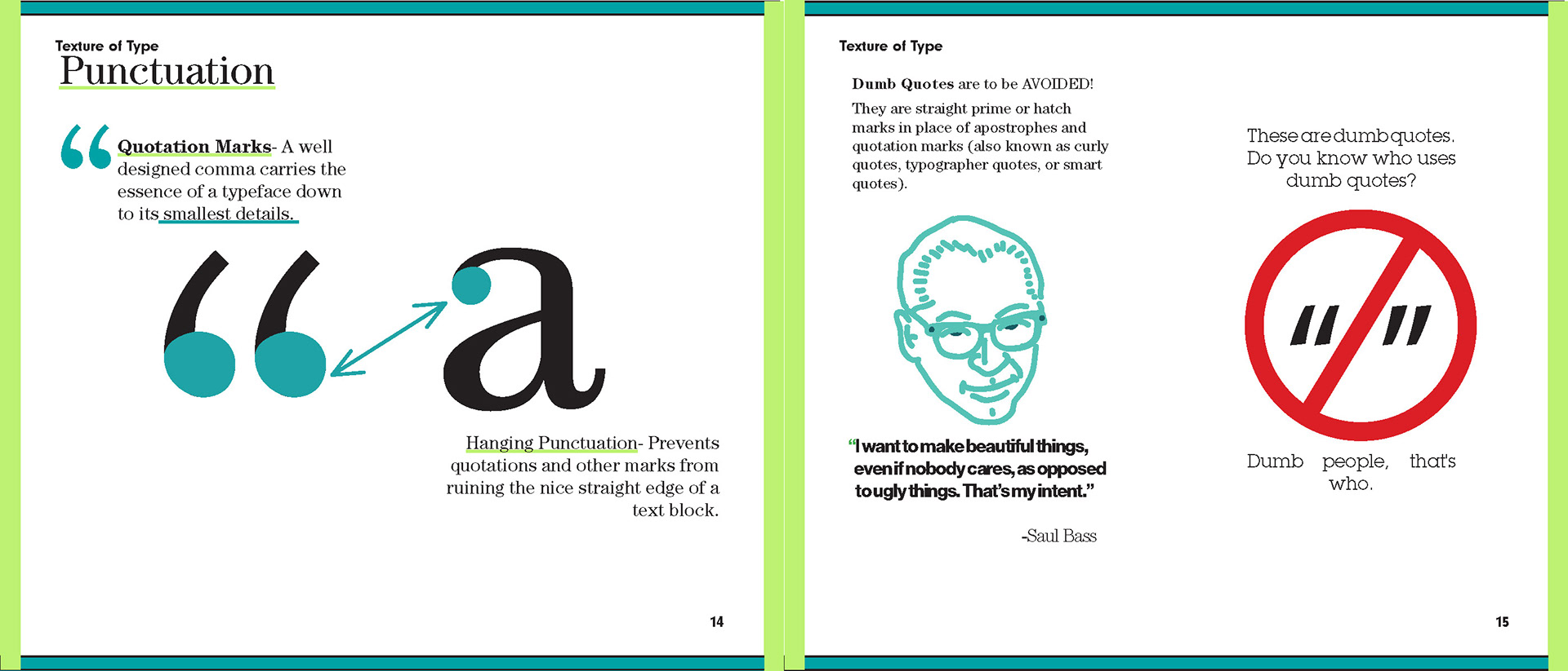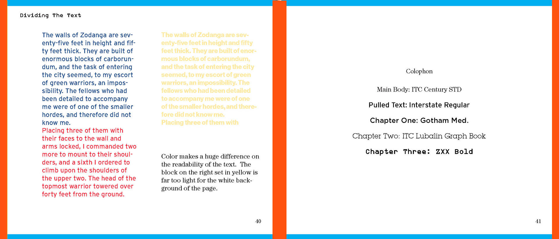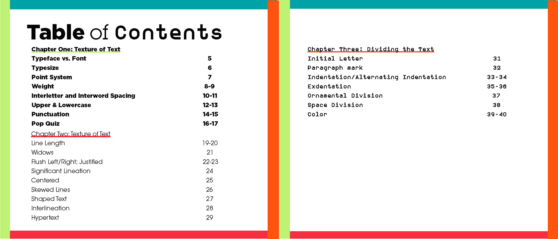 For my Advanced Typography class I was tasked to create a book using existing type about typography. I had creative control over color and font choice.
